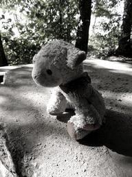 Keywords: teddy bear sad stuffed animal child lonely grey playground nature wood alone trist