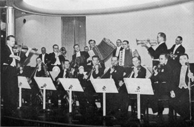 Keywords: Teddy Petersen orchestra.jpg en Danish bandleader Teddy Petersen 1892-1991 with his orchestra probably at restaurant Wivex at Tivoli in Copenhagen Petersen is standing to the far left with violin Otto Lington Jazz skal der til published in Copenhagen 1941 Author 1941 or earlier PD-Denmark50 PD-1996 Teddy Petersen |