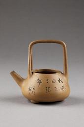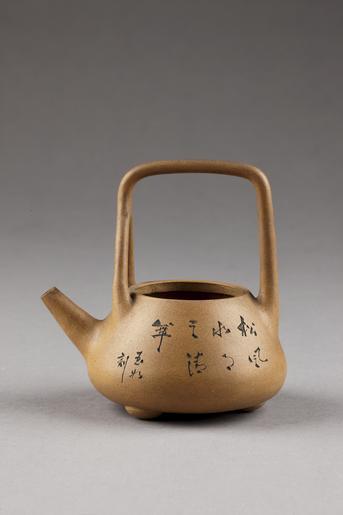 Keywords: Tekanna frÃ¥n Yixing i Kina med kinesiska tecken - Hallwylska museet - 95939.tif LSH artwork sv TEKANNA av Yixing stengods Tryckt päronformig upptill avskuren lock fattas; pip konisk; handtag rundstavigt vinkelböjt rakt uppstÃ¥ende främre fästet tvÃ¥delat och fäst pÃ¥ ömse sidor ovanför pipen; pÃ¥ tre lÃ¥ga fötter Ristad dekor ifylld med mörkgrÃ¥ färg PÃ¥ ena sidan ett landskap med ett berg och en hydda i förgrunden träd och buskar; pÃ¥ andra sidan kinesiska skrivtecken <br/>Inköpt genom Orvar Karlbeck 1923 <br/>Inskription Vindar frÃ¥n furorna och mÃ¥nens skugga i vattnet av Yan Rusi <br/>Tea-pot Yixing-ware Republican period 1911-23 bought in China in 1923 Poetic inscription Breezes from Pine Trees and Moon ™s Shadow in the Water by Yan Rusi Kangxi period 1702 original caption Tekanna frÃ¥n Yixing i Kina med kinesiska tecken <br/> Nyckelord Tekanna - 1911 1923 size cm 8 7 10 9 HWY place of origin CN original filename hm_dig12533 14387 inventory number HWY XLVIII XI B a c 07 95939 CC-BY-SA Jens Mohr <gallery caption Different images of same object > File Undersida av tekanna med stämpel och inventarienummer Yixing Kina - Hallwylska museet - 95940 tif </gallery> Tea pots Chinese ceramics in the Hallwyl Museum Sweden Jens Mohr Media contributed by LSH 2014-11 |