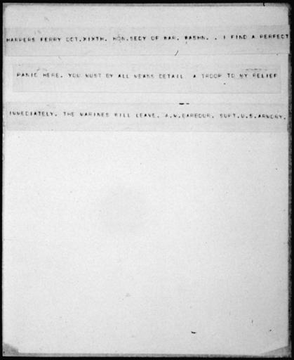 Keywords: Telegram from A.M. Barbour, Superintendent of the Arsenal at Harpers Ferry to the Secretary of War - NARA - 300374.jpg Scope and content On October 16 1859 John Brown and his army of some 20 men seized the federal arsenal at Harper's Ferry Virginia now West Virginia By the morning of October 18 Marines under the command of Bvt Col Robert E Lee stormed the building and captured Brown and the survivors of his party Even after Brown was captured false rumors persisted about abolitionists and slaves hiding in the mountains preparing for a new attack on the town It was in this atmosphere of panic as the Marines prepared to withdraw that the Superintendent sent this plea for help to the Secretary of War General notes Letters Received Main Series File W-386 Exhibit History American Originals December 1996 - December 1997 National Archives Rotunda Washington DC Exhibit No 624 0054 300374 Local identifier War Department The Adjutant General's Office 03/04/1907 - 09/18/1947 Archives I Reference Section Textual Archives Services Division NWCT1R National Archives Building 7th and Pennsylvania Avenue NW Washington DC 20408 1859-10-19 Record group Record Group 94 Records of the Adjutant General's Office 1762 - 1984 Record group ARC 423 Letters Received compiled 1805 - 1889 Series ARC 300368 File unit File unit ARC Variant control numbers NAIL Control Number NWCTB-94-CORRPI17E12-W386 1859 2<br /> NAIL Control Number NWDT1-94-CORR-PI17E12-W386 1859 2<br /> Other Identifier 03559<br /> This is the NARA internal exhibit tracking number Other versions <gallery> File Telegram_from_A M _Barbour _Superintendent_of_the_Arsenal_at_Harpers_Ferry_to_the_Secretary_of_War_-_NARA_-_300374 tif tif </gallery> NARA-cooperation PD-USGov Telegrams from the United States 1859 letters John Brown's raid on Harpers Ferry |