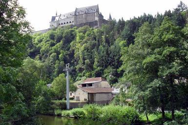 Keywords: TélésiègeVianden2.JPG fr Télésiège de Vianden passage au dessus de la rivière Our un affluent de la Sûre et vue sur le château own Legrand 2012 Cc-zero Vianden chairlift Vianden castle Our river in Vianden
