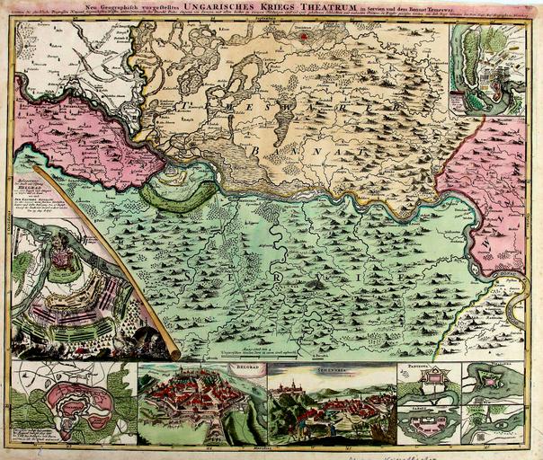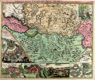 | Keywords: Temesi bánság és környéke az 1716-1717 Claude Florimond de Mercy térképe.jpg hu Homann Johann Baptist Neu geographisch vorgestelltes Ungarisches Kriegs Theatrum in Servien und dem Bannat Temeswar vorinen die glückliche progessen kayserl siegreichesten Waffen unter Commando des durchl Princ Eugenii von Savoyen Temesi bánság és környéke az 1716-1717 évi hadjáratok idején - Hadtörténelmi térkép - Domborzat halmos ábrázolással - Települések nagyság szerint jellel névvel - Hadműveletek bejelölve A karlócai béke 1699 értelmében a Temesi bánság területe változatlanul az Oszmán-török Birodalom fennhatósága alá tartozott 1716-ban a két császár között a hadiállapot azonban kiújult és a Savoyai Jenő vezette keresztény seregek látványos sikereket értek el 1716 augusztus 5-én legyőzték Péterváradnál a török fősereget Október 16-án a császári sereg bevonult Temesvárra a visszafoglalt Bánság első katonai főparancsnoka Claudius Florimond Mercy tábornagy lett Több csatát követően a császári seregek 1717 augusztus 22-én bevették Belgrádot A háborút az 1718-as pozsareváci béke zárta le http //www bergbook com/images/18250-01 jpg Homann Johann Baptist 1758 History of Hungary 1700-1825 PD-old-100 |