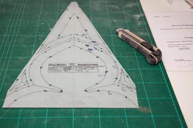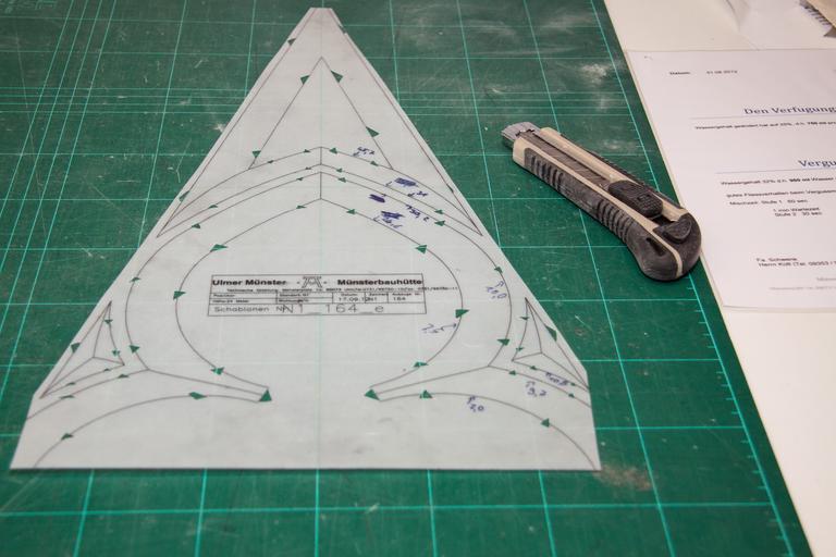 Keywords: template cut out pattern cut contours green triangles transferred to the surface of the stone transparent paper m 1zu1 cathedral construction hut ulm cutting knife cutting plate plan preparation