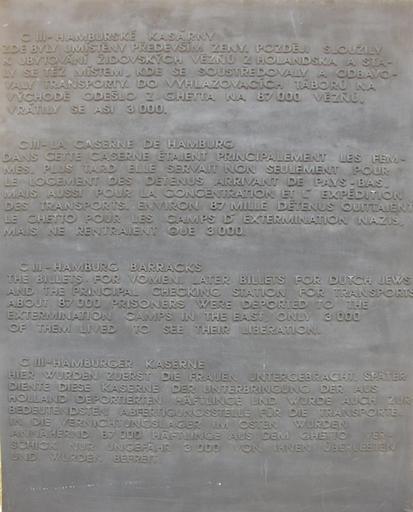 Keywords: Terezin CZ Hamburg Barracks plaque 0698.jpg Hamburská kasárna v Terezíně Pamětní deska na budově Hamburg Barracks in Terezín Memorial plaque on the building 50 30 31 7 N 14 08 59 6 E type landmark_region CZ Plaques in Terezín Multilingual plaques in the Czech Republic |