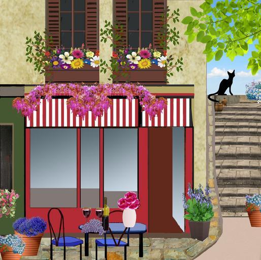 Keywords: terrace café bar restaurant tables chairs restaurant table coffee relax awning bistro flowers staircase wine glasses flower pots windows shutters black cat