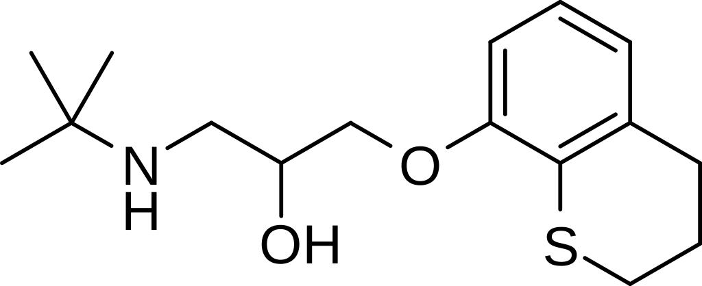 Keywords: Tertatolol.svg en 2D-structure of tertatolol own Harbinary 2010-01-26 Beta blockers Thiochromanes Phenol ethers Secondary alcohols Secondary amines