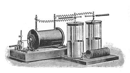 | Keywords: Tesla high-frequency apparatus (Rankin Kennedy, Electrical Installations, Vol V, 1903).jpg D'Arsonval apparatus invented by French physicist and doctor Jacque Arsene D'Arsonval around 1890 used in an obsolete Victorian-era medical field called electrotherapy It was a high frequency resonant oscillation transformer similar to a Tesla coil without the secondary winding which generated high voltage high frequency electricity It consisted of an induction coil rear that generated a high voltage of around 4 - 15 kV This repeatedly charged the two Leyden jar capacitors which repeatedly discharged with a spark through the spark gap The capacitors together with the solenoid coil front formed a tuned circuit and the spark excited damped oscillations in the tuned circuit The device produced an oscillating voltage of 20 - 30 kV with substantial current at frequencies of around 300 kHz - 5 MHz Wires from both ends of the coil to electrodes applied the current to the patient's body It was used for diathermy deep heating of tissue and several other therapies Tesla coils Electrotherapy |