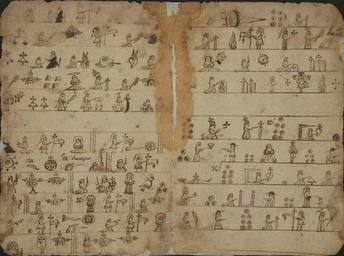 Keywords: Testerian Catechism WDL2964.jpg Artwork ru Тесте ианский катехизис fr Catéchisme testérien en Testerian Catechism zh Testerian 问答集 pt Catecismo testeriano ar كتيب تعاليم مسيحية بالرموز المصورة تستيريان ru Эта укопись начала XVI века известная как Тесте ианский катехизис является одним из наиболее п имечательных документов в а хивах Цент а по изучению исто ии ексики В анний пе иод испанского завоевания ексики до того как елигиозные наставники изучили языки местных на одов для асп ост анения х истианского Евангелия использовались иллюст и ованные исто ии п едставляющие основное учение Це кви Такие катехизисы назывались тесте ианскими по имени отца Хакобо-де-Тесте а ф анцисканского священника кото ый п идумал этот метод обучения <br>Католическая це ковь; Ф анцисканцы; Хакобо де Тесте а; Религиозные книги fr Ce manuscrit du début du 16ème siècle connu comme le catéchisme Testerian est l'un des documents les plus remarquables des archives du Centre pour l'Étude de l'Histoire du Mexique Au début de la conquête espagnole du Mexique avant que les instructeurs religieux n'aient appris les langues des peuples indigènes ils utilisèrent des histoires en images décrivant les enseignements de base pour diffuser l'évangile chrétien Ces catéchismes furent appelés Testerians d'après Père Jacobo de Testera un prêtre franciscain qui fut l'initiateur de cette méthode d'enseignement <br>Église catholique; Franciscains; Jacobo de Testera; Ouvrages religieux en This early-16th century manuscript known as a Testerian catechism is one of the more notable documents in the archives of the Center for the Study of the History of Mexico In the early period of the Spanish conquest of Mexico before religious instructors had learned the languages of the indigenous peoples they used pictorial stories describing basic teachings to spread the Christian Gospel These catechisms were called Testerians after Father Jacobo de Testera a Franciscan priest who pioneered this method of teaching <br>Catholic Church; Franciscans; Jacobo de Testera; Religious books zh 这份 16 世纪早 的手稿被人们称 Testerian 教义问答手册,是墨西哥历史研究中心档案中 著名的文献之 西班牙征 墨西哥早 , 宗教教师没 学会 著人民的语 前,他们使用图画故事 描绘基 的教义,传播基 教福音 这些教义问答手册被人们称为 Testerians,为的是纪念 布道事率先使用该方法的 芳济会神父 Jacobo de Testera <br>天主教会; 方济会; Jacobo de Testera; 宗教书籍 pt Este manuscrito do início de século XVI conhecido como um catecismo testeriano é um dos mais notáveis documentos dos arquivos do Centro para o Estudo da História do México No início do período da conquista espanhola do México antes que os catequistas tivessem aprendido as línguas dos povos indígenas eles utilizaram histórias pictóricas descrevendo ensinamentos básicos para difundir o evangelho cristão Estes catecismos foram chamados testerianos derivado do nome do Padre Jacobo de Testera um padre franciscano que foi pioneiro neste método de ensino <br>Igreja Católica; Franciscanos; Jacobo de Testera; Livros religiosos ar هذه المخطوطة التي ترجع إلى أوائل القرن السادس عشر والتي تعرف بالتعليم المسيحي التستيري هي من أبرز الوثائق في أرشيف مركز دراسات التاريخ المكسيكي في بداية فترة الغزو الإسباني للمكسيك، وقبل أن يتعلم أساتذة الدين لغات الشعوب الأصلية، كانوا يستخدمون القصص المصورة التي تصف التعاليم الأساسية لنشر الإنجيل وكانت هذه التعاليم تسمى بالتستيرية، نسبة إلى الأب جاكوبو دي تيستيريا، الكاهن الفرنسيسكاني الذي رود هذه الطريقة في التعليم <br>الكنيسة الكاثوليكية; الفرنسيسكان; هاكوبو دي تستيرا; الكتب الدينية es Este manuscrito de principios del siglo XVI conocido como un catecismo testeriano es uno de los más notables documentos entre los archivos del Centro de Estudios de Historia de México En los primeros tiempos de la conquista española de México antes de que los instructores religiosos hubiesen aprendido las lenguas de los pueblos indígenas se utilizaban historias pictóricas que describían las enseñanzas fundamentales para difundir el Evangelio cristiano Estos se llamaban catecismos testerianos en honor al padre Jacobo de Testera un sacerdote franciscano que fue pionero en este método de enseñanza <br>Iglesia católica; Franciscanos; Jacobo de Testera; Libros religiosos 1524 ru Рукописи fr Manuscrits en Manuscripts zh 手稿 pt Manuscritos ar مخطوطات es Manuscritos en 8 folios 15 5 x 11 centimeters ru Цент изучения исто ии ексики CARSO fr Centre d Études de l'Histoire du Mexique CEHM CARSO en Center for the Study of the History of Mexico CARSO zh 墨西哥 CARSO 历史研究中心 pt Centro de Estudos da História do México CEHM CARSO ar مركز دراسات التاريخ المكسيكي es Centro de Estudios de Historia de México CARSO object history exhibition history credit line place of creation ru ексика fr Mexique en Mexico zh 墨西哥 pt México