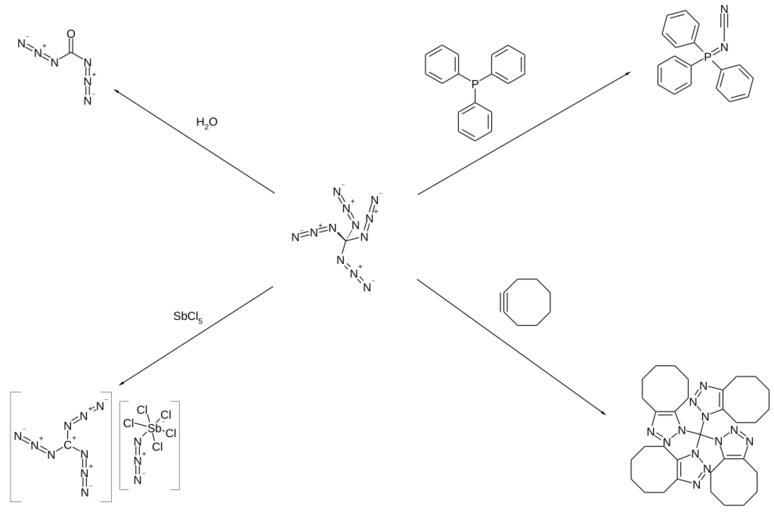 Keywords: Tetraazidomethane chemistry 01.svg en Chemistry of tetraazidomethane de Chemie der Tetraazidomethans own Steffen 962 2011-01-22 PD-chem Cc-zero Tetraazidomethane