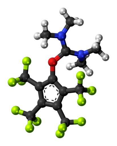 Keywords: tetramethyluronium trifluoromethyl cyclopentadienylide aromatic ball stick model molecule chemical structure atoms elements science research formula organic bonding connection 3d substance compound