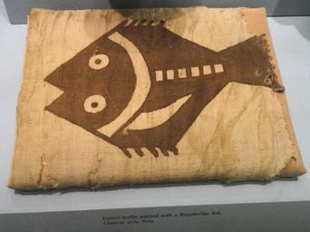 Keywords: Textile, cotton, painted with flounderlike fish, Chancay style - Peruvian fabric in the American Museum of Natural History - DSC06103.JPG Exhibit in the South American collection of the American Museum of Natural History Manhattan New York City New York USA Photography was permitted in the museum without restriction Daderot 2012-04-02 11 38 05 Daderot cc0 cc0 Peruvian fabric in the American Museum of Natural History Chancay fabric Painted textiles |