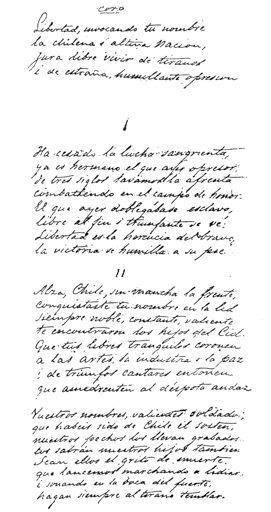 Keywords: Texto Lillo 1.JPG Texto original de Eusebio Lillo es Texto autógrafo del Himno Nacional de Chile con las modificaciones definitivas del año 1904 escrito de puño y mano por Eusebio Lillo y depositado en esa época en los archivos del Ministerio de Educación publicado en 1905 por Cannaro documento hoy extraviado own Osielvega 1904 Check categories 2009 June 13 es wikipedia Himno_Nacional_de_Chile Chile 6 National anthem of Chile |