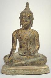 Keywords: Thai - Seated Buddha in "Maravijaya" - Walters 542551.jpg This square-faced image has some of the personable qualities of the Khmer or Lopburi tradition Unlike most 14th- and 15th-century images that look back to Khmer models it lacks the characteristic pinched pedestal and has instead a plain straight-sided pedestal that may be a variation on a type used in the 13th century century 15 leaded zinc-bronze lacquer gilt at knees cm 21 6 13 5 accession number 54 2551 18736 Alexander B Griswold Monkton Maryland prior ro 1977 Walters Art Museum Gift of A B Griswold 1977 none Recent Accessions The Walters Art Gallery Baltimore 1981 Unearthly Elegance Buddhist Art from the Griswold Collection The Walters Art Gallery Baltimore 1995 place of origin central Thailand Walters Art Museum license Thai sculptures in the Walters Art Museum Art of Ancient Thailand Media contributed by the Walters Art Museum needs category review |