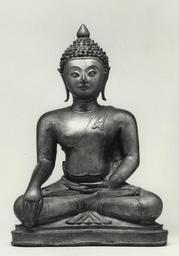 Keywords: Thai - Seated Buddha in "Maravijaya" - Walters 542833.jpg This is a Sihing-type image with stylistic traits associated with the city of Nakhon Si Thammarat It has not only the robe edge that runs from mantle to waist and the presence of pleats between the legs but also the broad face and particularly squat body characteristic of the local tradition The sculpture is a marriage although both head and body are old they were joined together at an unknown date perhaps relatively recently It is possible that both parts were made in Nakhon Si Thammarat at about the same time century 16 17 Ayutthaya leaded bronze leaded tin brass at knees cm 35 5 22 4 accession number 54 2833 27735 Alexander B Griswold Monkton presented to the Breezewood Foundation 1985 inv no 923 Walters Art Museum Henry Walters Bequest of A B Griswold 1992 none Unearthly Elegance Buddhist Art from the Griswold Collection The Walters Art Gallery Baltimore 1995 place of origin Nakhon Si Thammarat Thailand Walters Art Museum license Thai sculptures in the Walters Art Museum Art of Ancient Thailand Media contributed by the Walters Art Museum needs category review |