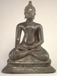 Keywords: Thai - Seated Buddha in "Maravijaya" - Walters 542763.jpg Sukhothai-tradition images of Sihing type range from classical restraint to images in which one or another feature seems excessively dominant and in which there is a quality that borders on parody This image approaches the parodic The misplacement of the head which had been broken at the neck exaggerates the eccentricity The sculpture could be looked upon as one of the very last productions of a Sukhothati workshop the face draws on the Sukhothai ideal and other features- such as the mantle and the position of the right hand- follow Sukhothai rather than Sihing conventions But the spreading pedestal and the schematic indication of folds in front of the ankles link it to the Nakhon Si Thammarat tradition century 15 16 Ayutthaya leaded zinc bronze at knees cm 34 2 19 5 accession number 54 2763 8655 Kamphaeng Phet Thailand Alexander B Griswold Monkton January 20 1951 presented to the Breezewood Foundation 1985 inv no 609 Walters Art Museum Henry Walters Bequest of A B Griswold 1992 none Unearthly Elegance Buddhist Art from the Griswold Collection The Walters Art Gallery Baltimore 1995 place of origin north central Thailand Walters Art Museum license Thai sculptures in the Walters Art Museum Art of Ancient Thailand Media contributed by the Walters Art Museum needs category review |