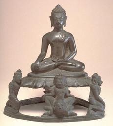 Keywords: Thai - Seated Buddha in "Maravijaya," on Base Featuring Mara's Warriors - Walters 542744.jpg This is a Sihing-type image with certain traits that link it to the Nakhon Si Thammarat tradition a robe edge running from mantle to wrist and folded pleats spread out in front of the ankles On a separately cast base are two warriors from Mara's army at left and right with a third warrior in a splayed-leg heraldic pose at the center Between his legs is a face to which he has seemingly just given birth The original names for these figures are not known but there are other ensembles with similar representations 1st half Other date century 16 Ayutthaya leaded zinc bronze figure zinc bronze base with base and at knees cm 18 9 accession number 54 2744 29142 Dr Carthew Alexander B Griswold Monkton June 1949 presented to the Breezewood Foundation 1965 inv no 546 Walters Art Museum Henry Walters Bequest of A B Griswold 1992 none Unearthly Elegance Buddhist Art from the Griswold Collection The Walters Art Gallery Baltimore 1995 place of origin north central Thailand Walters Art Museum license Thai sculptures in the Walters Art Museum Art of Ancient Thailand Media contributed by the Walters Art Museum needs category review |