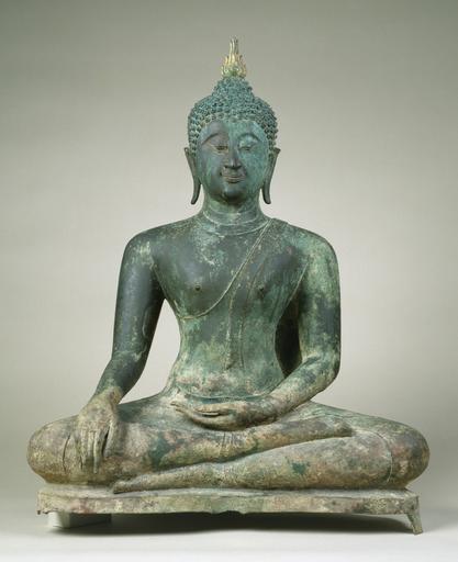Keywords: Thai - Seated Buddha in "Maravijaya" - Walters 542520.jpg In parts of Thailand a Buddha image is traditionally consecrated at dawn Wax covering the eyes of the image is removed and the sun's first rays breaking through the eastern entrance doors of the temple strike the golden image Meanwhile monks chant a verse proclaiming that one who knows the truth as taught by the Buddha can ward off evil just as the dawn drives away darkness and fills the air with light The consecration of the image is a reenactment of another event that occured at dawn Sakyamuni Buddha's final victory over evil some 2500 years ago in India The Buddha at this time of his victory is the subject of this image and of almost every primary image in the monastaries of Thailand The Buddha's right arm is lowered in the gesture that brought forth a flood that carried away the evil forces The waters of the oceans comprimised this flood and they were equivalent to the good deeds the Buddha had performed in his past lives The Thai of Sukhothai developed a new curvilinear style of image in the 14th century which is now looked upon as classic 2nd half Other date century 14 Sukhothai leaded bronze cm 71 55 accession number 54 2520 15634 Luang Ban Alexander B Griswold Monkton April 17 1949 presented to the Breezewood Foundation 1964 inv no 637 Walters Art Museum under the auspices of the Breezewood Foundation Gift of the Breezewood Foundation 1977 Unearthly Elegance Buddhist Art from the Griswold Collection The Walters Art Gallery Baltimore 1995 place of origin Sukhothai Thailand Walters Art Museum license Thai sculptures in the Walters Art Museum Art of Ancient Thailand Media contributed by the Walters Art Museum needs category review |