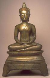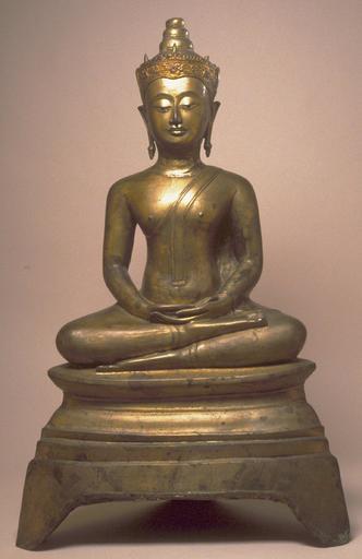 Keywords: Thai - Seated Crowned Buddha, in Meditation - Walters 542831.jpg The combination of wide eyes and narrow mouth gives this image a rather severe expression Though it is now obscured with lacquer and gilding the crown is of standard Ayutthaya type with raised-line ornament The typical Ayutthaya crowned Buddha with such features as the headdress of tiered rings appears to have become established at the end of the 15th century or during the course of the 16th; after that the sculptors varied little but the details of the decoration of the crown The headdress of tiered rings has forerunners in the Hindu images of Sukhothai century 16 Ayutthaya hollow cast leaded arsenical zinc bronze lacquer gilding at knees cm 67 5 32 3 accession number 54 2831 12624 Alexander B Griswold Monkton 1951 presented to the Breezewood Foundation 1965 inv no 898 originally no 557 Walters Art Museum Henry Walters Bequest of A B Griswold 1992 none Unearthly Elegance Buddhist Art from the Griswold Collection The Walters Art Gallery Baltimore 1995 place of origin central Thailand Walters Art Museum license Thai sculptures in the Walters Art Museum Art of Ancient Thailand Media contributed by the Walters Art Museum needs category review Gilding bronze sculptures |