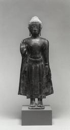 Keywords: Thai - Standing Buddha in "Abhayamudra" - Walters 542803.jpg Although the position of the hand might suggest that this image was made earlier 13th century bronzes seem to offer nothing really close in expression The firmness and sobriety of this expression suggest a sculptor so out-of-tune with the times that he is something of a scold This image may be the product of an ethnically distinct workshop maintaining ties to the Khmer tradition century 14 15 bronze cm 45 8 accession number 54 2803 26295 Private collection Thonburi Thailand Alexander B Griswold Monkton April 13 1951 presented to the Breezewood Foundation December 1960 inv no 475 Walters Art Museum Henry Walters Bequest of A B Griswold 1992 none Unearthly Elegance Buddhist Art from the Griswold Collection The Walters Art Gallery Baltimore 1995 place of origin central Thailand Walters Art Museum license Thai sculptures in the Walters Art Museum Art of Ancient Thailand Media contributed by the Walters Art Museum needs category review |