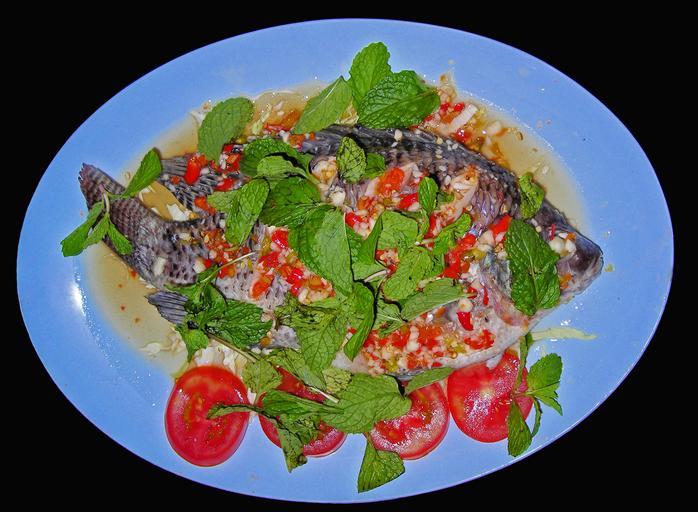 Keywords: Thai steamed fish with lime juice-2.jpg en Pla nueng manao Thai ปลานึ่งมะนาว Fish steamed with lime juice The fish is pla nin Thai ปลานิล Oreochromis niloticus so this dish would in full be called pla nin nueng manao Thai ปลานิลนึ่งมะนาว <br><br> Most recipes call for the fish to be steamed plain and then smothered in a dressing of chopped garlic chillies lime juice fish sauce and chicken stock The spearmint bai saranae Thai ใบสะระแหน่ Mentha spicata is used to cover up the somewhat strong smell of this particular fish but it is more common to see this dish served with coriander/cilantro leaves phak chi Thai ักชี instead of mint Thai steamed fish with lime juice jpg Mattes <span class signature-talk >talk</span> derivative work an-d <span class signature-talk >talk</span> 2009-03-05 freigestellt Teller repariert Helligkeit etwas angepasst Steamed food of Thailand Fish dishes of Thailand Mint leaves in Thai cuisine Plan views of food Steamed fishes Cuisine of central Thailand Taken with Nikon Coolpix L2 Work by Mattes 2007 Oreochromis niloticus User Mattes/Contributions/Topics/Nutrition User Mattes/Contributions/Topics/Thailand Garlic dishes |