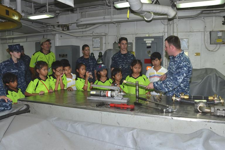 Keywords: Thai students tour USS Frank Cable 140328-N-WC566-010.jpg en Hull Maintenance Technician 2nd Class Brandon Callow right shows students from the Mosaic School Program in Thailand objects produced in the pipe shop aboard the submarine tender USS Frank Cable AS 40 Frank Cable forward deployed to the island of Guam conducts maintenance and support of submarines and surface vessels deployed in the U S 7th Fleet area of responsibility and is currently on a scheduled underway period U S Navy photo by Mass Communication Specialist Seaman Gabrielle Joyner/Released 2014-03-28 Petty Officer 3rd Class Gabrielle Joyner https //www dvidshub net/image/1215271 140328-N-WC566-010 2014-04-02 00 39 SATTAHIP TH PD-USGov-Military-Navy Sattahip USS Frank Cable AS-40 Images from DoD uploaded by Fæ |