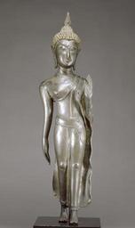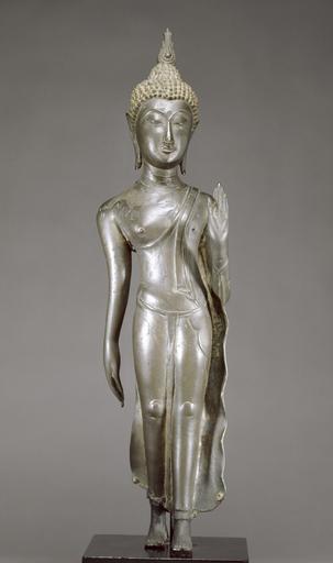 Keywords: Thai - Walking Buddha - Walters 542765.jpg Freestanding images of the Buddha had not been made anywhere in Asia before they were created by Thai sculptors in Sukhothai in the 14th century What is the Buddha doing It is possible to imagine that he is descending from heaven where according to legend he preached to his deceased mother one rainy season Or he might be merely walking This is considered on of the four postures the others are sitting standing and reclining In the Thai language the walking Buddha is just called graceful lila century 15 brass cm 51 accession number 54 2765 36064 Private collection Kamphaeng Phaet Alexander B Griswold Monkton January 20 1951 presented to the Breezewood Foundation December 1961 inv no 613 Walters Art Museum Henry Walters Bequest of A B Griswold 1992 none Unearthly Elegance Buddhist Art from the Griswold Collection The Walters Art Gallery Baltimore 1995 Eternal Presence Handprints and Footprints in Buddhist Art Katonah Museum of Art Katonah; Honolulu Academy of Arts Honolulu; Rubin Museum of Art New York 2004-2005 place of origin Kamphaeng Phet Thailand Walters Art Museum license Thai sculptures in the Walters Art Museum Art of Ancient Thailand Media contributed by the Walters Art Museum needs category review |