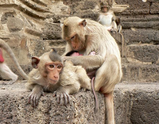 Keywords: thailand monkeys lampang guenon family maternity primate wild tenderness protection