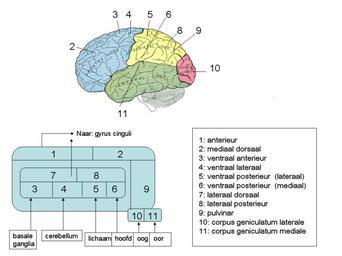 Keywords: Thalamus.PNG nl wikipedia 2007 December 12 Linksonder schematische voorstelling van de thalamus en voornaamste specifieke kerngebieden Ook de input naar thalamus van enkele belangrijke zintuigen zien horen tast en subcorticale areae cerebellum basale ganglia is hierbij weergegeven Gebieden 1 en 2 maken vormen de mediale kerngroepen en liggen in feite meer naar 'binnen' toe in de thalamus Overige gebieden vormen de laterale aan zijkant gelegen kerngroepen Boven de gebieden in de neocortex lateraal aanzicht die met een aantal van deze kerngebieden zijn verbonden nl wikipedia 2007-01-15 Albert Kok wikipedia nl Albert Kok Original upload log page nl wikipedia Thalamus PNG 2007-01-16 11 06 Albert Kok 960×720×8 212124 bytes <nowiki></nowiki> 2007-01-15 14 12 Albert Kok 960×720×8 192399 bytes <nowiki></nowiki> Brain Thalamus |