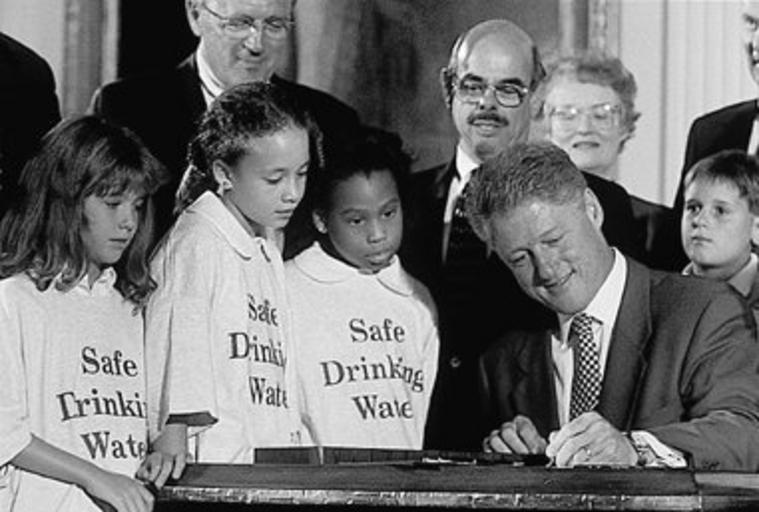 | Keywords: The 1996 amendments to the Safe Drinking Water Act.jpg Safe Drinking Water Act as children and others watch On August 6 1996 President Clinton signed amendments to the Safe Drinking Water Act to implement comprehensive public health protection from the source to the tap The changes further expanded the scope of SDWA established a more rational science-based decision-making process including risk tradeoffs and better addressed the compliance challenges that small systems face The new law also established the Revolving Loan Program a grant to states for financing infrastructure projects at low interest rates https //www prlog org/12535532-chicago-officials-blamed-for-lead-contaminated-drinking-water html Chicago Contaminated Drinking Water Other changes include enhancing the Source Water Protection program and expanding grants to tribes Alaska native villages and colonias 2014-09-10 https //www flickr com/photos/usepagov/15011059880/ USEPA Environmental-Protection-Agency other versions PD-USGov United States Environmental Protection Agency |
