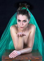 Keywords: the act of girl character portrait beauty blowing breath look tulle green greenness hands table