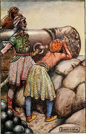 Keywords: The Adventures of Akbar artillery.jpg News echoed Sumbal contemptuously; we have half a hundred such runaways coming in every day It is no news that King Humâyon is better liked than Kumran Lo hast thou it at last He snatched the portfire from the sergeant and went toward the gun Stay one moment friend said the grave and silent man with sudden command in his voice A moment's hastiness may bring disaster Discretion is better than valour Yonder boy brings news ”he waves his arms ”he shouts Stay at least till we can hear what he says Sumbal laughed Bah But see you I stay my hand while I count ten ”no more One two three four The artillery men amused at the race leaned over He runs well ”He will win ”He will lose ”He climbs like a hill cat ” ” Five six seven eight nine And now unintelligible from sheer breathlessness Roy's voice is heard The grave silent Râjput leaps out to meet him Ten Sumbal's hand swings the portfire to the breech Roy sees it throws up his arms wildly and with a cry ” The bastion The bastion The Heir-to-Empire falls headlong into the Râjput's arms What did he say asked the master fireworker pausing half surprised half angry But the Râjput was too busy tearing aside Roy's flimsy bloodstained waistcoat to answer Something about the bastion and the Heir-to-Empire master said the sergeant doubtfully Mayhap 'twould be as well to wait till we can see more clearly Kumran he added in a lower voice would stick at naught ” ” Sumbal hesitated then put down the portfire and walked over to the fallen lad beside whom the stranger was kneeling He is not dead He is not dead said the grave silent Râjput looking up his face working the tears streaming down his bronzed cheek My master is not dead Who asked Sumbal uncomprehending I knew it must be he went on the man exultantly even in his grief None could do that sort of thing save a Sun hero My Master my King See here the race mark on his breast The sign of uttermost truth My Master My King But Roy did not hear himself called thus He did not even know for days afterwards if he had succeeded or if he had failed; for a wound just above the heart close to the sign-mark of his race very nearly carried him off into the Shadowy Land where all things are remembered yet all are forgotten But he had succeeded He had saved the Heir-to-Empire's life that dawn and a day or two afterwards Kumran daily more hated for his cruelty had escaped and the soldiers rejoiced to get rid of him flung open the gates of the Bala Hissar thus ending Prince Akbar's adventures 1913 http //www heritage-history com/www/heritage-books php Dir books MenuItem display author steel book akbar story dawn Creator John Liston Byam Shaw PD-old Artillerymen The Adventures of Akbar Mughal artillery Artillery in art |