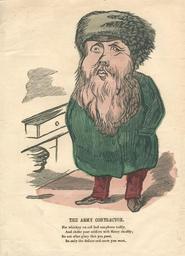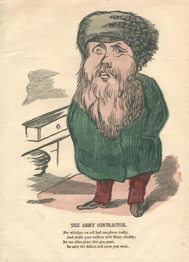 | Keywords: library company of philadelphia librarycompanyofphiladelphia united states unitedstates history civil war civilwar 1861-1865 18611865 s.l. : s.n. slsn cartoons wit humor cartoon "The Army Contractor" shows a bearded man in a fur hat and coat, with his hands in his pocket. He stands near a chest with drawers. The valentine criticizes contractors for their dishonest practices. Camphene is a mixture of oils used for lamp fuel and explosives. Text: For whiskyy [i.e. whiskey] ou [i.e. you] sell bad camphene toddy,/ And clothe poor soldiers with flimsy shoddy;/ Its not after glory you pant,/ Its only after dollars and cents you want. "The Army Contractor" shows a bearded man in a fur hat and coat, with his hands in his pocket. He stands near a chest with drawers. The valentine criticizes contractors for their dishonest practices. Camphene is a mixture of oils used for lamp fuel and explosives. Text: For whiskyy [i.e. whiskey] ou [i.e. you] sell bad camphene toddy,/ And clothe poor soldiers with flimsy shoddy;/ Its not after glory you pant,/ Its only after dollars and cents you want. |