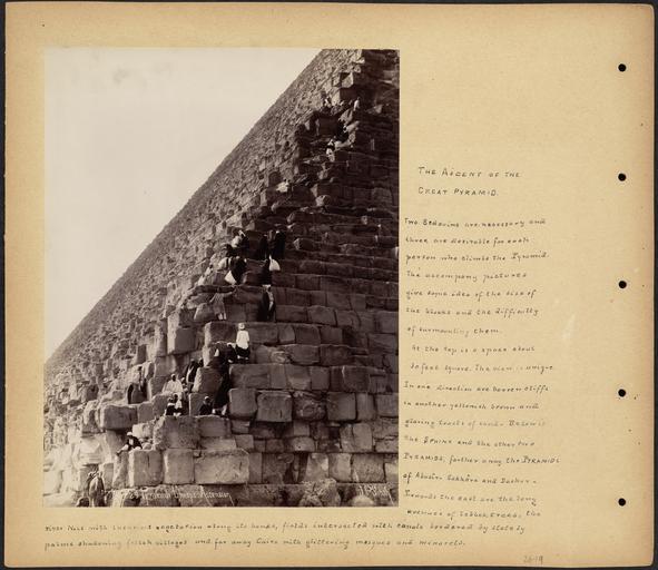 Keywords: The Ascent of the Great Pyramid by Boston Public Library.jpg Scrapbook page containing one photograph of people climbing up the side of the Pyramid of Cheops in Egypt annotated with information about the process of climbing and the view from the top Subjects Egypt travel photography pyramids tombs Jīzah Ahrāmāt al- Page size 33 x 38 1 cm Annotations Two Bedouins are necessary and three are desirable for each person who climbs the Pyramid The accompany pictures give some idea of the size of the blocks and the difficulty of surmounting them At the top is a space about 30 feet square The view is unique In one direction are barren cliffs in another yellowish brown and glaring tracts of sand Below is the Sphinx and the other two Pyramids farther away the Pyramids of Abusîr- Sakkâra and Dashur- Towards the east are the east are the long avenues of lebbek trees the river Nile with luxuriant vegetation along its banks fields intersected with canals bordered by stately palms shadowing fellah villages and far away Cairo with glittering mosques and minarets Language English photograph has French title Rights No known restrictions Coverage Egypt Notes Title supplied by cataloger derived from captions or annotated information Format Scrapbooks Technique Photographs Albumen prints BPL Department Print Department Photo 1 Photographer Sébah J Pascal Title 229 Pyramide Chèops Ascension Caption The Ascent of the Great Pyramid Date ca 1860-1890 Flickr data on 2011-08-03 Camera Sinar AG Sinarback 54 FW Sinar m License CC BY 2 0 User Boston Public Library BPL Flickr http //flickr com/photos/24029425 N06/2468305153 The Ascent of the Great Pyramid December 21 1892 March 8 1893 Flickr upload date 2008-05-01 17 11 03 William Vaughn Tupper Flickr uploader http //www flickr com/people/24029425 N06 BPL User Flickr upload bot/upload 14 48 3 August 2011 UTC Fæ CC BY 2 0 PD-old-100 Historical images of Great Pyramid 1890s Tupper Scrapbooks volume 26 Lower Egypt Climbing the Great Pyramid of Giza 1890s Photos uploaded from Flickr by Fæ using a script Bedouins in Egypt Jean Pascal Sebah |