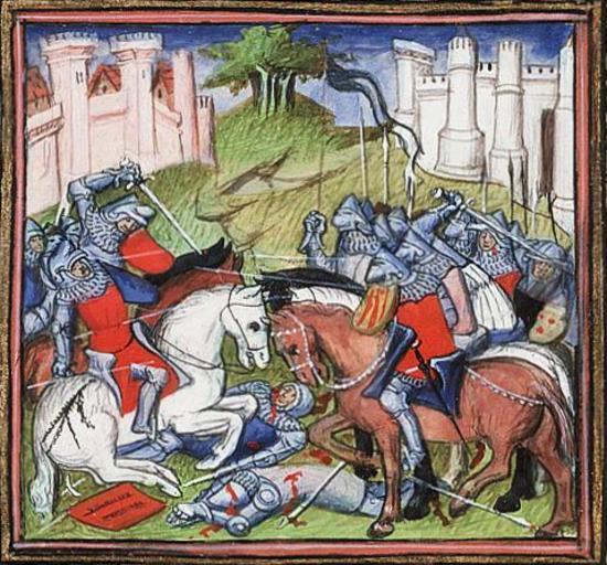 | Keywords: The battle of Calais.jpg en Jean Froissart Chroniques Vol I The battle of Calais Place of origin date Paris Virgil Master illuminator ; c 1410 Material Vellum ff 382 385x288 243x187 mm 42 lines littera cursiva Binding 18th-century brown leather; gilt; with coat of arms of Stadholder William V Decoration 1 two-column miniature 170x180 mm ; 29 column miniatures 115/65x95/80 mm ; 1 historiated initial 45x50 mm ; decorated initials with border decoration ff 1r 24r 36r 62r 74v etc Provenance Louis de Luxemburg conn štable de France d 1475; signature erased ; by descent to his granddaughter Françoise de Luxembourg and her husband Philip of Cleves d 1528; coat of arms with label over erasure; signature ; purchased in 1531 from Philip's estate by HenriIII Count of Nassau d 1538 ; by descent to the Princes of Orange-Nassau the later Stadholders at The Hague; carried off in 1795 to Paris by the French and restituted to the Koninklijke Bibliotheek in 1816 http //www kb nl/manuscripts/show/manuscript/72+A+25 Jean Froissart Chroniques Vol I Virgil Master illuminator ca 1410 Edward III of England Chroniques de Froissart vol 1 - Den Haag KB 72 A 25 c 1410 Medieval miniatures of battles Bataille de Calais PD-old-100 |