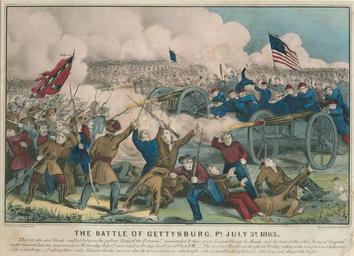 | Keywords: library company of philadelphia librarycompanyofphiladelphia united states unitedstates history civil war civilwar 1861-1865 18611865 currier & ives currierives gettysburg pennsylvania soldier rifle army cannons outdoor "This terrific and bloody conflict between the gallant "Army of the Potomac," commanded by their great General George G. Meade, and the host of the rebel "Army of Virginia" under General Lee, was commenced on Wednesday July 1st, and ended on Friday the 3d at 5 o'clock P.M._ The decisive battle was fought on Friday, ending in the complete rout & dispersion of the rebel army. _ Undying fame and a nations thanks, are ever due to the heroic soldiers, who fought with such unflinching bravery, this long and desperate fight." View showing the Union army firing cannons into a flank of Confederate soldiers during the bloodiest battle of the Civil War. In the foreground, Confederates lay wounded, retreat, and scratch their heads in bewilderment. In the background, flanks of troops advance against each other. "This terrific and bloody conflict between the gallant "Army of the Potomac," commanded by their great General George G. Meade, and the host of the rebel "Army of Virginia" under General Lee, was commenced on Wednesday July 1st, and ended on Friday the 3d at 5 o'clock P.M._ The decisive battle was fought on Friday, ending in the complete rout & dispersion of the rebel army. _ Undying fame and a nations thanks, are ever due to the heroic soldiers, who fought with such unflinching bravery, this long and desperate fight." View showing the Union army firing cannons into a flank of Confederate soldiers during the bloodiest battle of the Civil War. In the foreground, Confederates lay wounded, retreat, and scratch their heads in bewilderment. In the background, flanks of troops advance against each other. |