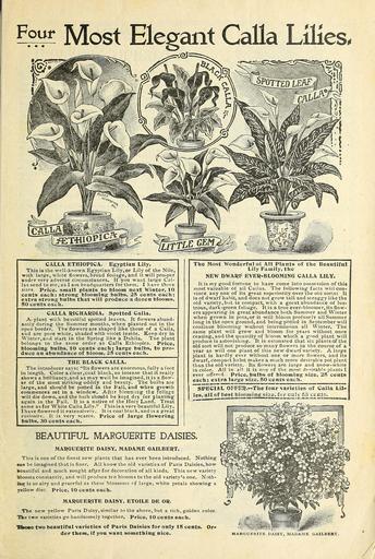 | Keywords: The best homes in America plant my flowers, why not you? (16388386592).jpg fe Most Elegant Calla Lilies <br> CALLA ETHIOPICA Egyptian Lily <br> This is the well-known Egyptian Lily or Lily of the Nile <br> with large white flowers broad foliage and it will prosper <br> under very adverse circumstances If you want large Cal- <br> las send to me as I am headquarters for them I have three <br> sizes Price small plants to bloom next Winter 10 <br> cents each; strong blooming bulbs 25 cents each; <br> extra strong bulbs that will produce a dozen blooms <br> 50 cents each <br> CALLA RICHARDIA Spotted Calla <br> A plant wilh beautiful spotted leaves It flowers abund- <br> antly during the Summer months when planted out in the <br> open border The flowers are shaped like those of a Calla <br> and are pure white shaded with violet inside Keep dry in <br> Winter and start in the Spring like a Dahlia Tne plant <br> belongs to the same order as Calla Ethiopica Price <br> blooming bulbs 10 cents each; large bulbs to pro- <br> duce an abundance of bloom 25 cents each <br> THE BLACK CALLA <br> The introducer says Its flowers are enormous fully afoot <br> in length Color a clear coal black so intense that it really <br> shows a brilliancy and as may well be imagined it is a flow- <br> er of the most striking oddity and beauty The bulbs are <br> large and should be potted in the Fall and when growth <br> commences set in a window After blccixiag tie foliage <br> will die down and the bulb should be kept dry for planting <br> again in the Fall It is a native of the Holy Lanrf Treat <br> same as for White Caila Lily This is a very beautiful Lily <br> I have flowered it extensively It is coal black and is a great <br> curiositv It is very scarce Price of large flowering <br> bulbs 30 cents each <br> The Most Wonderful oJ All Plants of the Beautifttl <br> Lily Family the <br> NEW DWARF EVER-BLOOMING CALLA LILY <br> It is my good fortune to have come into possession of this <br> most valuable of all Callas The following facts will con- <br> vince any one of its great superiority over the old sorts It <br> is of dwarf habit and does not grow tall and scraggy like the <br> old variety but is compact with a great abundance of lus- <br> trous dark green foliage It is a true ever-bloomer its flow- <br> ers appearing in great abundance both Summer and Winter <br> when grown in pots or it will bloom profusely all Summer <br> long in the open ground and being potted in September will <br> continue blooming without intermission all Winter The <br> same plant will grow and bloom for years without once <br> ceasing and the quantity of bloom which a gnod plant will <br> produce is astonishing It is estimated that six plantsof the <br> old sort will not produce so many flowers in the course of a <br> year as will one plant of this new dwarf variety A large <br> plant is hardly ever without one or more flowers and its <br> dwarf compact habit makes a much more desirable pot plant <br> than the old variety Its flowers are large and snow-white <br> in color All in all it is one of the most desirable plants I <br> ever offered Price bulbs of blooming size 25 cents <br> each; extra large size 50 cents each <br> SPECIAL OFFER ” The lour varieties of Calla Lil- <br> ies all of beat btoosgi ng si z e f of esSy ST <br> BEAUTIFUL MARGUERITE DAISIES <br> MARGUERITE DAISY MADAME GAILBERT <br> This is one of the finest new plants that has ever been introduced Nothing <br> ean be imagined that is finer All know the old varieties of Paris Daisies how <br> beautiful and much sought af er for decoration of all kinds This new variety <br> blooms constantly and will produce ten blooms to the old variety's one Noth- <br> ing is so airy and graceful as these blossoms cf large white petals showing a <br> yellow disc Price 10 cents each <br> MARGUERITE DAISY ETOILE DE OR <br> The new yellow Paris Daisy similar to the above but a rich golden color <br> The two varieties go handsomely together Price 10 cents each <br> These two beautiful varieties of Paris Daisies for only 15 cents Or- <br> der them if you want something nice <br> MARGUERITE DAISY MADAME GAILBERT 41847004 130961 64578 Text http //www biodiversitylibrary org/page/41847004 1899 10 5962/bhl title 64578 Ella V Baines Firm ; Henry G Gilbert Nursery and Seed Trade Catalog Collection NameFound Calla ethiopica NameConfirmed Calla aethiopica L EOLID 1127679 NameBankID 611142 NameFound Ethiopica NameConfirmed Ethiopica EOLID 66302 NameBankID 4162235 NameFound Richardia NameConfirmed Richardia EOLID 29640 NameBankID 387684 Biodiversity Heritage Library Miss Ella V Baines the Woman Florist Springfield Ohio The best homes in America plant my flowers why not you Garden Stories Bulbs Plants Catalogs Flowers Plants Ornamental Seed industry and trade Seeds Trade catalogs U S Department of Agriculture National Agricultural Library bhl page 41847004 dc identifier http //biodiversitylibrary org/page/41847004 bhlGardenStories BHLinbloom bulbs plants plants ornamental u s department of agriculture national agricultural library bhlgardenstories bhlinbloom Information field Flickr posted date ISOdate 2015-01-28 CC-BY-2 0 BioDivLibrary https //flickr com/photos/61021753 N02/16388386592 2015-08-24 07 55 05 cc-by-2 0 PD-old-70-1923 Photos uploaded from Flickr by Fæ using a script The best homes in America The best homes in America plant my flowers, why not you? (16388386592).jpg fe Most Elegant Calla Lilies <br> CALLA ETHIOPICA Egyptian Lily <br> This is the well-known Egyptian Lily or Lily of the Nile <br> with large white flowers broad foliage and it will prosper <br> under very adverse circumstances If you want large Cal- <br> las send to me as I am headquarters for them I have three <br> sizes Price small plants to bloom next Winter 10 <br> cents each; strong blooming bulbs 25 cents each; <br> extra strong bulbs that will produce a dozen blooms <br> 50 cents each <br> CALLA RICHARDIA Spo