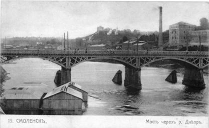 Keywords: The bridge across the Dnieper River in Smolensk and Volkov tower.jpg en The bridge across the Dnieper River in Smolensk now destroyed Right on the other side of the tower is visible Volkov Smolensk fortress wall ru ост че ез Днеп в Смоленске ныне уничтожен остались уины Сп ава на д угом бе егу видна Волкова башня Смоленской к епостной стены О игинальная отк ытка е установлены До 1917 года PD-RusEmpire 20th-century postcards of Russia Postcards of Smolensk Dnieper River in Smolensk