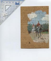 Keywords: The Cavaliers - Los Caballeros.miniature painting & over-written message.post-card art.unsigned.circa-1904.Sgouros collection-item 1.scan.01.obverse.jpg en The Cavaliers - Los Caballeros; 2 horsemen in full military uniform with red tunics riding across a countryside From the uniforms could be anything from Napoleonic era N I to contemporary to the 1890s-1900s miniature painting over-written message on a post-card unsigned circa-1904 Sgouros collection-item 1 scan jpg Impressionist style; somewhat resembling anticipates a modern-art romantic-novel book-cover of the 1960s-1970s Spanish Impressionist school Madrid-style ; circa 1904 - postcard message is dated 28 Octobre 1904 therefore presumably the artwork was created some time before this date Especially given that the oil paint has been overwritten was presumably already dry at the time The painting is executed in oils on a fairly heavy-guage brown cardstock; unsigned artist not known The image fills the central-right portion of one side of the card with an irregular border; overwritten with the post-card's message-content inverse to the orientation of the image in ink pencil Condition is generally good; some blotches wear scuffing corners slightly worn exact original shade of the cardstock uncertain but it was almost certainly some shade of cardboard-brown to begin with Address postage stamp postmarked on reverse; postmark not yet read TARJETA POSTAL UNION POSTAL UNIVERSAL ESPANA Exposicion Martinez Hortaleza I -- Madrid Hortaleza is an area of Madrid Private collection fam Sgouros This upload made possible by Elios Jessie Sgouros scan of original artwork; created by the uploader unsigned artist not yet identified circa 1904 PD-old Scan of the reverse at 200px Notes I have uploaded this item here rather than at English Wikipedia in the hopes of attracting more interest potential scholarship in researching the origins the artist IF anyone wants to seriously dispute the copyright status please transfer to wp/EN rather than just delete Paintings Art of Spain 1904 in Spain 1900s art Miniatures 1900s postcards of Spain Cavalry in paintings Impressionist paintings of people Impressionist paintings of horses Impressionist paintings in Spain |