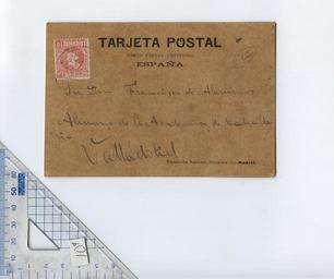Keywords: The Cavaliers - Los Caballeros.miniature painting & over-written message.post-card art.unsigned.circa-1904.Sgouros collection-item 1.scan.02.reverse.jpg en The Cavaliers - Los Caballeros; 2 horsemen in full military uniform with red tunics riding across a countryside From the uniforms could be anything from Napoleonic era N I to contemporary to the 1890s-1900s miniature painting over-written message on a post-card unsigned circa-1904 Sgouros collection-item 1 scan jpg Impressionist style; somewhat resembling anticipates a modern-art romantic-novel book-cover of the 1960s-1970s Spanish Impressionist school Madrid-style ; circa 1904 - postcard message is dated 28 Octobre 1904 therefore presumably the artwork was created some time before this date Especially given that the oil paint has been overwritten was presumably already dry at the time The painting is executed in oils on a fairly heavy-guage brown cardstock; unsigned artist not known The image fills the central-right portion of one side of the card with an irregular border; overwritten with the post-card's message-content inverse to the orientation of the image in ink pencil Condition is generally good; some blotches wear scuffing corners slightly worn exact original shade of the cardstock uncertain but it was almost certainly some shade of cardboard-brown to begin with Address postage stamp postmarked on reverse; postmark not yet read TARJETA POSTAL UNION POSTAL UNIVERSAL ESPANA Exposicion Martinez Hortaleza I -- Madrid Hortaleza is an area of Madrid Private collection fam Sgouros This upload made possible by Elios Jessie Sgouros scan of original artwork; created by the uploader unsigned artist not yet identified circa 1904 PD-old Scan of the obverse at 200px Notes I have uploaded this item here rather than at English Wikipedia in the hopes of attracting more interest potential scholarship in researching the origins the artist IF anyone wants to seriously dispute the copyright status please transfer to wp/EN rather than just delete Paintings Art of Spain 1904 postcards of Spain 1904 postmarks Madrid in the 1900s Orange stamps 1900s stamps Stamps of Alfonso XIII of Spain History of Valladolid |
