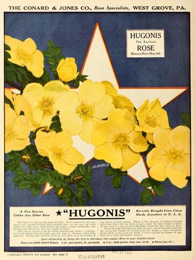 Keywords: The Conard and Jones Co. roses (15768349033).jpg THE CONARD JONES CO Rose Specialists WEST GROVE PA <br> A New Species <br> Unlike Any Other Rose <br> ¢ HUGONIS <br> Recently Brought from China <br> Hardy Anywhere in U S A <br> This Rose is a spectacular sliow in itself Eveo' branch of the pre- <br> vious year's growth becomes lined on both sides to the very tip with <br> closely set wide open single flowers like dainty yellow hollyhocks and <br> the branches bend over with the weight of bloom <br> This unique species is fine for shrub planting and makes a symmet- <br> rical bush about 6 feet in height and the same in diameter when fully <br> matured Picture this exquisite bush on your lawn or at the corners of <br> Earn distinction by being the first to introduce this unique Rose in your neighborhood <br> Prices for OWN-ROOT Plants l-yr pot-grown 1 postpaid ¢ 2-yr fleld-grown Star size 2 50 -k Extra size S D <br> your house in early spring Think of the pleasure of looking forward <br> daily from about the last week in April when the buds begin to form <br> till the plant is a mass of fairy-like fluffy bloom the first week in May <br> When through blooming you will still have a most beautiful bush for <br> the acacia-like foliage on arching branches makes a most decorative <br> shrub which as far as we are aware is never touched by disease of any <br> kind but is clean and healthy always <br> D Indicates delivery not prepaid See page 3 <br> ©C1A55869 42491739 134610 67174 Text http //www biodiversitylibrary org/page/42491739 1920 10 5962/bhl title 67174 Conard Jones Co West Grove Pa ; Conard Jones Co West Grove Pa ; Henry G Gilbert Nursery and Seed Trade Catalog Collection Biodiversity Heritage Library Conard star roses autumn 1923 Garden Stories Catalogs Fruit Plants Ornamental Rose culture Roses Seeds U S Department of Agriculture National Agricultural Library bhl page 42491739 dc identifier http //biodiversitylibrary org/page/42491739 Rosa hugonis bhlGardenStories BHLinbloom plants ornamental u s department of agriculture national agricultural library bhlgardenstories bhlinbloom Information field Flickr posted date ISOdate 2015-01-28 CC-BY-2 0 BioDivLibrary https //flickr com/photos/61021753 N02/15768349033 2015-08-25 04 52 22 cc-by-2 0 PD-old-70-1923 1920 catalogs The Conard Jones Co roses Photos uploaded from Flickr by Fæ using a script Yellow flowers |