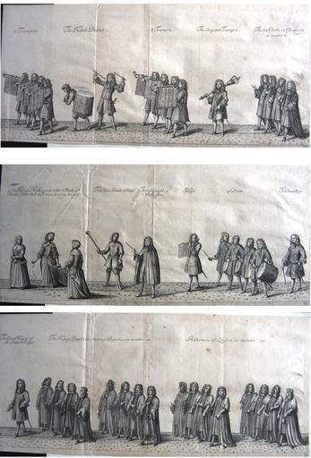Keywords: The Coronation Procession of King James II and Queen Mary of Modena (c. 1685, full version).jpg William Sherwin Joseph Collins and others A digital reproduction of the first three out of 19 sheets of a copper engraving of the coronation procession of w James II of England and Queen Mary of Modena The coronation took place at Westminster Abbey on 1685 04 23 The first sheet appears to be in the centre the second sheet at the top and the third sheet at the bottom ca 1685 copper engraving laid on to old album paper Each sheet mm 225 495 accession number object history Created by William Sherwin Joseph Collins and others in London credit line Centre sheet The Kings Herbwoman her 6 Maids w<sup>h</sup> Baskets of Sweet Herbs strewing the way / The Deans Beadle of Westm<sup>r</sup> / The high Constable of Westminster / A Fife musical instrument Fife / + Drums / The drum major Drum Major <br> Top sheet 8 Trumpets / The Kettle Drums / 8 Trumpets / The Sergeant Trumpet / The Six Clerks in Chancery in number 6 <br> Bottom sheet The Closet Keeper of the Chapell Royal / The Kings Chaplains having Dignities in number 14 / Court of Aldermen Aldermen of London in number 25 http //www michaelfinney co uk/catalogue/category/item/index cfm asset_id 1793 other versions The Coronation Procession of King James II and Queen Mary of Modena c 1685 jpg PD-Art-100 1685 engravings Coronations in England Coronations in art James II of England Mary of Modena Kettle drums |