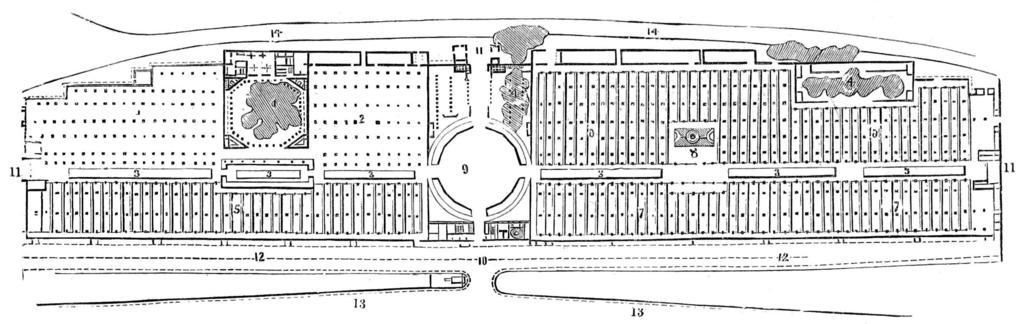 | Keywords: The Crystal Palace page 22.jpg Ground Plan of the Building Committee's Design for the Great Exhibition of 1851 1 Machinery in Motion 2 Other Machinery 3 Seats for Visitors 4 Refreshment Courts 5 Raw Materials 6 Manufactures 7 Sculpture and the Plastic Arts 8 Small Court 9 The Rotunda 10 Principal Entrance and Executive Offices 11 The Other Entrances 12 The Drive in the Park 13 The Kensington Road 14 The Queen's Private Road 1851 The Crystal Palace Its Architectural History and Constructive Marvels https //archive org/details/crystalpalaceits00berl Peter Berlyn and Charles Fowler Jnr Engravings by George Measom 1818-1901 PD-old-auto-1923 1901 The Crystal Palace book Proposed Buildings for the Great Exhibition |