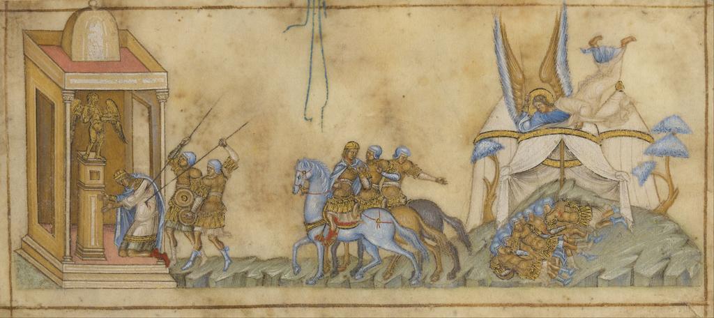 | Keywords: The Death of Sennacherib - Google Art Project.jpg One of two surviving miniatures from a book of Old Testament prophets made in Sicily around 1300 the illumination shows three separate episodes from the Israelites' battle with Sennacherib king of Assyria now Iraq as recounted by the prophet Isaiah The angel flying above a pile of corpses on the right illustrates the first episode Then the angel of the Lord went forth and smote in the camp of the Assyrians a hundred and eighty-five thousand; and when they arose early in the morning behold they were all dead corpses In the center scene surrounded by dead corpses Sennacherib and his remaining troops depart for the city of Nineveh The story's climactic ending occurs on the left Sennacherib's two sons betray him stabbing him in the back as he prays before a pagan idol His death saves the Israelites from Assyrian occupation The artist painted the miniature in an elegant late Byzantine style seen in the careful modeling of the horses the figures' elongated proportions and the finely observed details of the soldiers' armor The blue lines descending into the top center of the miniature are the remains of a decorative letter from the now-lost text above None 430703 Unknown /collection/the-j-paul-getty-museum/artwork/the-death-of-sennacherib-unknown/6874835/ Unknown illuminator /collection/the-j-paul-getty-museum/ The J Paul Getty Museum 343005 http //www getty edu/museum 3/12/2012 11 59 38 PM /collection/the-j-paul-getty-museum/artwork/the-death-of-sennacherib-unknown/6874835/ 1300 about 1300 Deaths Sennacherib Angels Sennacherib Tempera colors and gold on parchment 73 6874835 True 1300 3/25/2012 2 47 04 PM lido getty edu-gm-obj112308 http //www getty edu/art/gettyguide/artObjectDetails artobj 112308 http //www getty edu/legal/copyright html Detached leaf 1300 1310 Italy Creation w175 x h73 cm about 1300 False 2 24561403508772 Part the-death-of-sennacherib-unknown The Death of Sennacherib d 175 Tempera colors and gold on parchment Deaths Sennacherib Angels Sennacherib http //www getty edu/legal/copyright html special url_id RAHAMMQARr191A PD-old-100 Google Art Project works by unknown artist Angel decimates Sennacherib's army MS 35 Getty museum Miniatures of Saint Michael |