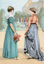 Keywords: The Delights of the Malmaison - A saunter through the park in 1804.jpg Artwork This plate depicts two women in the gardens of Malmaison the château that was refurbished by Napoleon's first wife Josephine The château is located several miles outside of Paris The woman dressed in green is wearing a more modern style of city dress or 'costume de ville' where her dress is shorter and does not train on the ground behind her She is wearing a corsage froncé or gathered at the chest The waist on the dress remains high but her sleeves are short and balloon out The woman on the right wears a hat 'à la polonaise' with a square top as well as a Spencer jacket modeled after the English style over her long empire-waist dress 1898 1 colored plate 10 x 15 cm Institution Brown University Library object history exhibition history credit line accession number 1145807800826473 PD-old-100 Images of Paris from the Brown University Library Les modes de Paris 020 Fashion in 1804 Château de Malmaison 1804 in Île-de-France Females with green dresses in art 1800s dresses Spencer jacket Polonaise fashion |