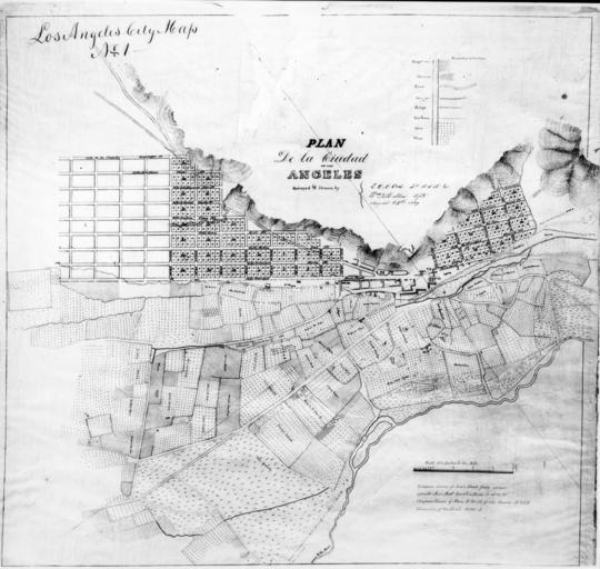 Keywords: The E.O.C. Ord's first map of the city of Los Angeles, drawn in August 29, 1849 (CHS-6040).jpg Photograph of the E O C Ord's first map of the city of Los Angeles drawn in August 29 1849 The grid up north near the mountains represent downtown Los Angeles The blocks in downtown Los Angeles are further divided into numbered sections The lower half of the map represents the greater Los Angeles area which is broken into smaller sections and labeled with names a majority of which are Spanish or Mexican names of the landowners ; Legible writings include Los Angeles city map no 1 plan de la ciudad de los Angeles surveyed and drawn by E O C Ord Lt U S A Wm R Hutton afst August 29 1849 explanation of signs plough ground gardens road sanja hedge pole fence corn vines calle de las Chapulas Grasshopper St calle de las Flores Flower St calle de las Esperanza Hope St calle de las Caridad Charity St calle Acey Zuna Olive St calle Loma Hill St calle Fortin Fort St calle Primarera Spring St calle Principal Main St calle 1 1st St calle 2 2nd St calle 3 3rd St calle 4 4th St calle 5 5th St calle 6 6th St calle 7 7th St calle 8 8th St c corla Short St calle eternidad Eternity St calle de Torra Bull St calle de las Arispas Hornet St calle de las Adobos mag Meridian variation 1 E 44 E Juan Rurus Lucero Jose Sepulveda D Ybarra G Ybarra Topias T Tapia Juana Rendon Ballestero Juan Apoblasa F Abita Alila Juan Domingo Maximo Alanis Vicente Sanchez F Alvarado Miguel Pryor Antonio M Lugo Atonio T Abila Ciara Reyes Clara Reyes Zanja to the mesa sana over which the river spreads its waters which are wasted Juan Luis Vignes Ricardo McLaughlin Lamuel Carpenter Feliz Gallardy Valenzuela Bened da Polamares Cata Victoria Higuera widow of Vicente Sanchez wife of Casaldo Aguilar Benancia Sotelo William Wolfskill Narcesso Botelo Antonio F Coronel Antonio G Abila Yguacio Machado Luis Lamerean Juan Cabary Alanis Mariano Jordan Cristobol Aguilar Isidero Reyes scale of 10 inches to the mile compass course of Main Street from corner opposite Jose Ant Carillos House S 24° 45' W compass course of Main Street north of the Church N 9½° E variation of the needle 12° 44' E ; Thanks to the efforts of two men we have a fairly good view of what the pueblo of Los Angeles looked like at the middle of the 19th century Lieutenant Edward O C Ord surveyed the pueblo and his assistant William Rich Hutton sketched many scenes of the pueblo and drew the first map from Ord's survey Ord was in California when the gold rush struck with its resultant skyrocketing of prices Since the military salaries no longer covered living expenses his commander suggested that the younger officers take on other jobs to supplement their income At about this time Los Angeles officials needed to have a survey of the public lands in order to sell them and Ord was hired as the surveyor He chose William Hutton as his assistant and together the two mapped Los Angeles in July and August of 1849 The Los Angeles City Archives has the original map produced by Hutton from Ord's survey -- unknown author http //digitallibrary usc edu/cdm/ref/collection/p15799coll65/id/12770 1849-08-29 Hutton William Rich William Rich Hutton Los Angeles in the 1840s California Historical Society Collection 1860-1960 PD-old-100-1923 |