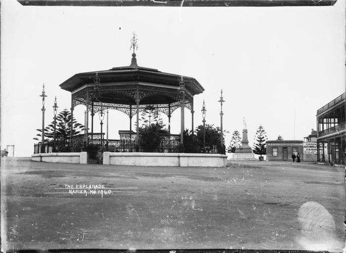 | Keywords: blackandwhite monochrome outdoor black and white View of Marine Parade, Napier. The band rotunda in the centre has wrought-iron tracery around the top and beneath the railings. There are street lamps around the rotunda, the South African War memorial is to the right, and the premises of the New Zealand Accident Insurance Company on the right again. Photograph taken by William Archer Price, circa 1910s Inscriptions: Inscribed - Photographer's title on negative -bottom left: The Esplanade. Napier. No. 1940. Quantity: 1 b&w original negative(s). Physical Description: Dry plate glass negative 4.5 x 6.5 inches The Esplanade (Marine Parade) at Napier. Price, William Archer, 1866-1948 :Collection of post card negatives. Ref: 1/2-001380-G. Alexander Turnbull Library, Wellington, New Zealand. natlib.govt.nz/records/23040553 View of Marine Parade, Napier. The band rotunda in the centre has wrought-iron tracery around the top and beneath the railings. There are street lamps around the rotunda, the South African War memorial is to the right, and the premises of the New Zealand Accident Insurance Company on the right again. Photograph taken by William Archer Price, circa 1910s Inscriptions: Inscribed - Photographer's title on negative -bottom left: The Esplanade. Napier. No. 1940. Quantity: 1 b&w original negative(s). Physical Description: Dry plate glass negative 4.5 x 6.5 inches The Esplanade (Marine Parade) at Napier. Price, William Archer, 1866-1948 :Collection of post card negatives. Ref: 1/2-001380-G. Alexander Turnbull Library, Wellington, New Zealand. natlib.govt.nz/records/23040553 |