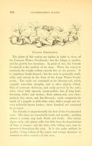 | Keywords: The field and garden vegetables of America (Page 214) (6002095515).jpg 214 <br> CUCL'RMTACEGUS TLAls'TS <br> Canada Crookneck <br> The plants of this variety are similar in habit to those of <br> the Common Winter Crookneck ; but the foliage is smaller <br> and the growth less luxuriant In point of size the Canada <br> Crookneck is the smallest of its class When the variety is <br> unmixed the weight seldom exceeds five or six pounds It <br> is sometimes bottle-formed ; but the neck is generally small <br> solid and curved in the form of the Large Winter Crook- <br> necks The seeds are contained at the blossom-end which <br> expands somewhat abruptly and is often slightly ribbed <br> Skin of moderate thickness and easily pierced by the nail ; <br> color when fully ripened cream-yellow but if long kept <br> becoming duller and darker ; flesh salmon-red very close- <br> grained dry sweet and fine-flavored ; seeds comparatively <br> small of a grayish or dull-white color with a rough and un- <br> even yellowish-brown border ; three hundred are contained <br> in an ounce <br> The Canada is unquestionably the best of the Crooknccked <br> sorts The vines are remarkably hardy and prolific ; yielding <br> almost a certain crop both North and South The variety <br> ripens early; the plants suffer but little from the depredations <br> of bugs or worms ; and the fruit with trifling care may be <br> preserved throughout the year It is also quite uniform in <br> quality ; being seldom of the coarse and stringy character so <br> common to other varieties of this class 29062552 92326 42073 Page 214 Text http //www biodiversitylibrary org/page/29062552 1863 10 5962/bhl title 42073 Burr Fearing Biodiversity Heritage Library The field and garden vegetables of America United States Varieties Vegetable gardening Vegetables Library Congress bhl page 29062552 dc identifier http //biodiversitylibrary org/page/29062552 united states Information field Flickr posted date ISOdate 2011-08-02 CC-BY-2 0 BioDivLibrary https //flickr com/photos/61021753 N02/6002095515 2015-09-10 20 55 14 cc-by-2 0 PD-old-70-1923 The field and garden vegetables of America Photos uploaded from Flickr by Fæ using a script |