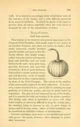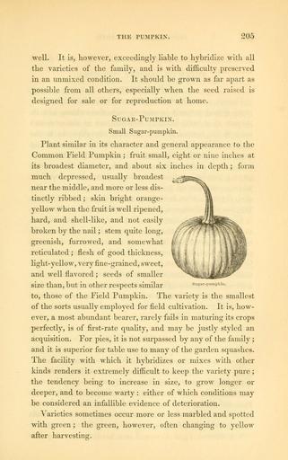 Keywords: The field and garden vegetables of America (Page 205) (6002641544).jpg THE PUMPKIN <br> 205 <br> well It is however exceedingly liable to hybridize with all <br> the varieties of the family and is with difficulty preserved <br> in an unmixed condition It should be grown as far apart as <br> possible from all others especially when the seed raised is <br> designed for sale or for reproduction at home <br> Sugar-Pumpkin <br> Small Sugar-pumpkin <br> Plant similar in its character and general appearance to the <br> Common Field Pumpkin ; fruit small eight or nine inches at <br> its broadest diameter and about six inches in depth ; form <br> much depressed usually broadest <br> near the middle and more or less dis- <br> tinctly ribbed; skin bright orange- <br> yellow when the fruit is well ripened <br> hard and shell-like and not easily <br> broken by the nail ; stem quite long <br> greenish furrowed and somewhat <br> reticulated ; flesh of good thickness <br> light-yellow very fine-grained sweet <br> and well flavored ; seeds of smaller <br> size than but in other respects similar <br> to those of the Field Pumpkin The variety is the smallest <br> of the sorts usually employed for field cultivation It is how- <br> ever a most abundant bearer rarely fails in maturing its crops <br> perfectly is of first-rate quality and may be justly styled an <br> acquisition For pies it is not surpassed by any of the family ; <br> and it is superior for table use to many of the garden squashes <br> The facility with which it hybridizes or mixes with other <br> kinds renders it extremely difficult to keep the variety pure ; <br> the tendency being to increase in size to grow longer or <br> deeper and to become warty either of which conditions may <br> be considered an infallible evidence of deterioration <br> Varieties sometimes occur more or less marbled and spotted <br> with green ; the green however often changing to yellow <br> after harvesting <br> r-pimipkii 29062543 92326 42073 Page 205 Text http //www biodiversitylibrary org/page/29062543 1863 10 5962/bhl title 42073 Burr Fearing Biodiversity Heritage Library The field and garden vegetables of America United States Varieties Vegetable gardening Vegetables Library Congress bhl page 29062543 dc identifier http //biodiversitylibrary org/page/29062543 united states Information field Flickr posted date ISOdate 2011-08-02 CC-BY-2 0 BioDivLibrary https //flickr com/photos/61021753 N02/6002641544 2015-09-10 20 55 52 cc-by-2 0 PD-old-70-1923 The field and garden vegetables of America Photos uploaded from Flickr by Fæ using a script |