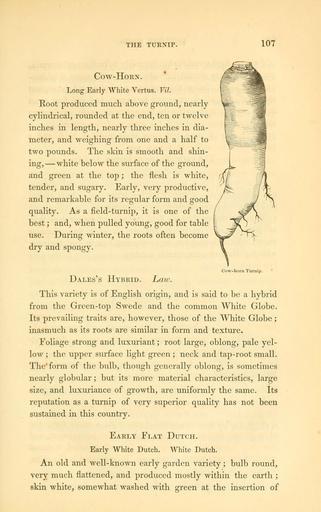 Keywords: The field and garden vegetables of America (Page 107) (6002091059).jpg THE TURNIP <br> 107 <br> Cow-Horn <br> Long Early White Vertus Vil <br> Root produced much above ground nearly <br> cylindrical rounded at the end ten or twelve <br> inches in length nearly three inches in dia- <br> meter and weighing from one and a half to <br> two pounds The skin is smooth and shin- <br> ing ” white below the surface of the ground <br> and green at the top ; the flesh is white <br> tender and sugary Early very productive <br> and remarkable for its regular form and good <br> quality As a field-turnip it is one of the <br> best ; and when pulled young good for table <br> use During winter the roots often become <br> dry and spongy <br> Dales's Hybrid Laiv <br> Cow-horn Turnip <br> This variety is of English origin and is said to be a hybrid <br> from the Green-top Swede and the common White Globe <br> Its prevailing traits are however those of the White Globe ; <br> inasmuch as its roots are similar in form and texture <br> Foliage strong and luxuriant ; root large oblong pale yel- <br> low ; the upper surface light green ; neck and tap-root small <br> The' form of the bulb though generally oblong is sometimes <br> nearly globular ; but its more material characteristics large <br> size and luxuriance of growth are uniformly the same Its <br> reputation as a turnip of very superior quality has not been <br> sustained in this country <br> Early Flat Dutch <br> Early White Dutch White Dutch <br> An old and well-known early garden variety ; bulb round <br> very much flattened and produced mostly within the earth ; <br> skin white somewhat washed with green at the insertion of 29062445 92326 42073 Page 107 Text http //www biodiversitylibrary org/page/29062445 1863 10 5962/bhl title 42073 Burr Fearing Biodiversity Heritage Library The field and garden vegetables of America United States Varieties Vegetable gardening Vegetables Library Congress bhl page 29062445 dc identifier http //biodiversitylibrary org/page/29062445 united states Information field Flickr posted date ISOdate 2011-08-02 CC-BY-2 0 BioDivLibrary https //flickr com/photos/61021753 N02/6002091059 2015-09-10 21 02 50 cc-by-2 0 PD-old-70-1923 The field and garden vegetables of America Photos uploaded from Flickr by Fæ using a script |