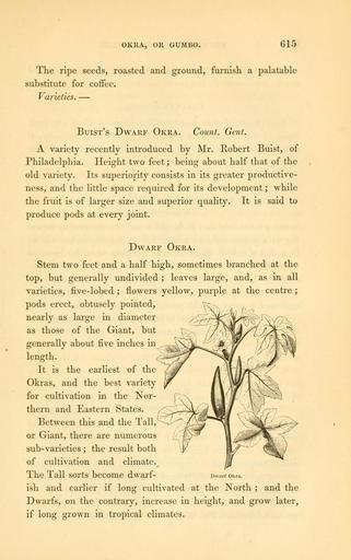 Keywords: The field and garden vegetables of America (Page 615) (6002099787).jpg OKRA OR GUMBO <br> 615 <br> The ripe seeds roasted and ground furnish a palatable <br> substitute for coffee <br> Varieties ” <br> Buist's Dwarf Okra Count Gent <br> A variety recently introduced by Mr Robert Buist of <br> Philadelphia Height two feet ; being about half that of the <br> old variety Its superiority consists in its greater productive- <br> ness and the little space required for its development ; while <br> the fruit is of larger size and superior quality It is said to <br> produce pods at every joint <br> Dwarf Okra <br> Stem two feet and a half high sometimes branched at the <br> top but generally undivided ; leaves large and as in all <br> varieties five-lobed ; flowers yellow purple at the centre ; <br> pods erect obtusely pointed <br> nearly as large in diameter <br> as those of the Giant but <br> generally about five inches in <br> length <br> It is the earliest of the <br> Okras and the best variety <br> for cultivation in the Nor- <br> thern and Eastern States <br> Between this and the Tall/ <br> or Giant there are numerous <br> sub-varieties ; the result both <br> of cultivation and climate <br> The Tall sorts become dwarf- <br> ish and earlier if long cultivated at the North and the <br> Dwarfs on the contrary increase in height and grow later <br> if long grown in tropical climates <br> Dwarf Okra 29062953 92326 42073 Page 615 Text http //www biodiversitylibrary org/page/29062953 1863 10 5962/bhl title 42073 Burr Fearing Biodiversity Heritage Library The field and garden vegetables of America United States Varieties Vegetable gardening Vegetables Library Congress bhl page 29062953 dc identifier http //biodiversitylibrary org/page/29062953 united states Information field Flickr posted date ISOdate 2011-08-02 CC-BY-2 0 BioDivLibrary https //flickr com/photos/61021753 N02/6002099787 2015-09-10 20 58 28 cc-by-2 0 PD-old-70-1923 The field and garden vegetables of America Photos uploaded from Flickr by Fæ using a script |